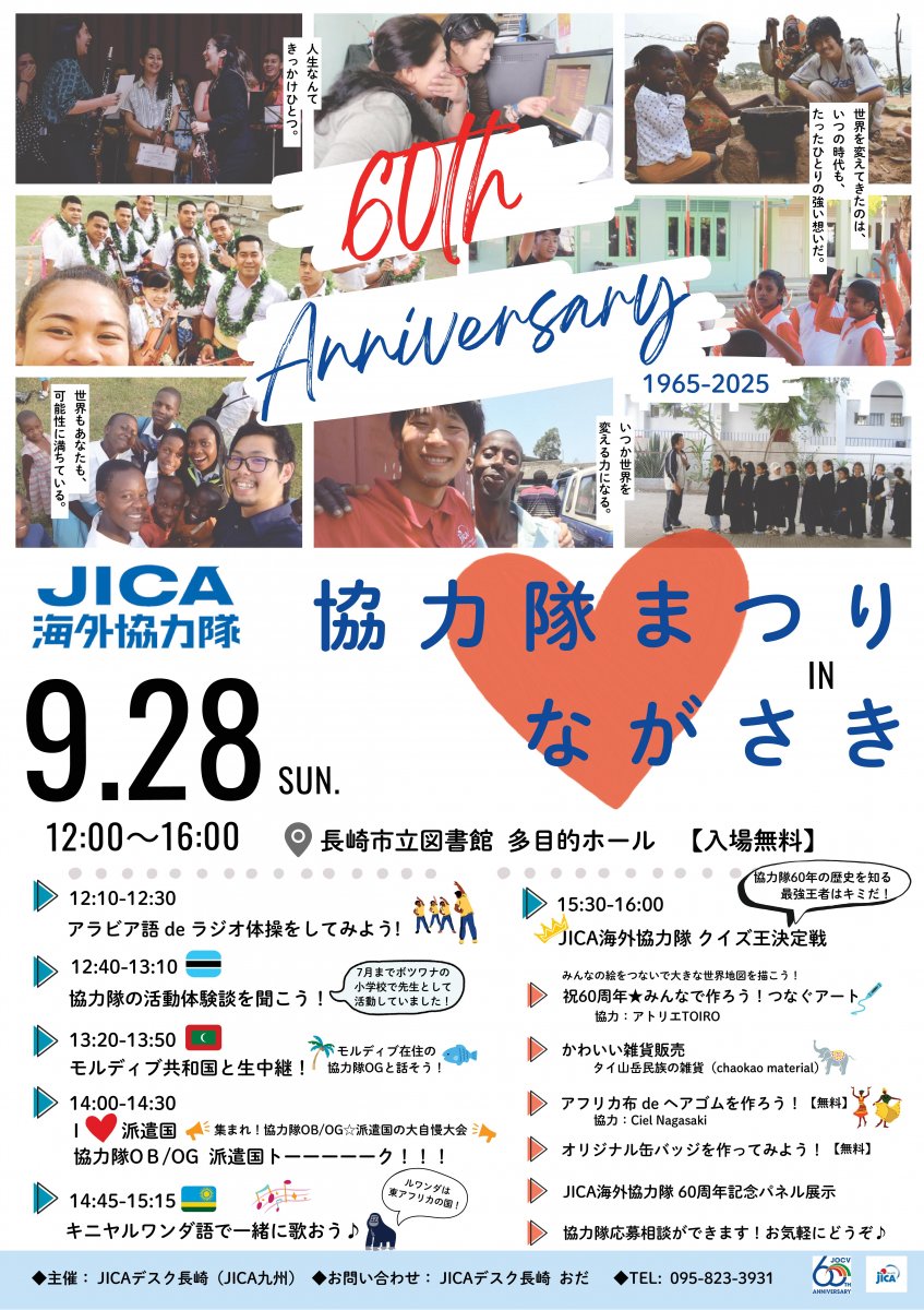 JICA海外協力隊60周年を記念し、「協力隊まつり in ながさき」を開催いたします。「協力隊体験談発表」や「アラビア語deラジオ体操」、「モルディブ共和国と生中継」など盛りだくさん!みんなで作る「つなぐアート」や、「アフリカ布のヘアゴム作り」、「タイのかわいい雑貨販売」もあります!入場無料!どなたでもご参加ください!たくさんのご来場をお待ちしています!
