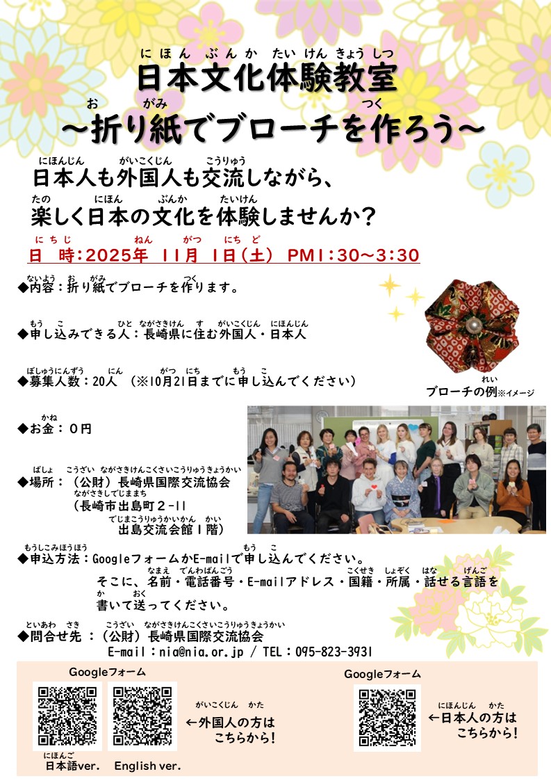 日本文化(にほんぶんか)体験(たいけん)教室(きょうしつ)「折(お)り紙(がみ)でブローチを作(つく)ろう」の 参加者(さんかしゃ)を 募集(ぼしゅう)します!